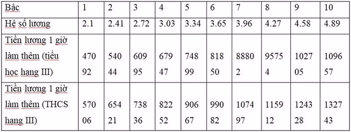 Tiền lương làm thêm giờ 1 tiết của giáo viên tiểu học hạng III, trung học cơ sở hạng III:
