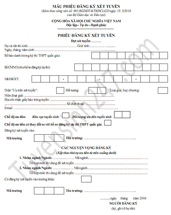 Mẫu phiếu Đăng ký xét tuyển đại học, cao đẳng năm 2016 chính thức của Bộ GD&ĐT: