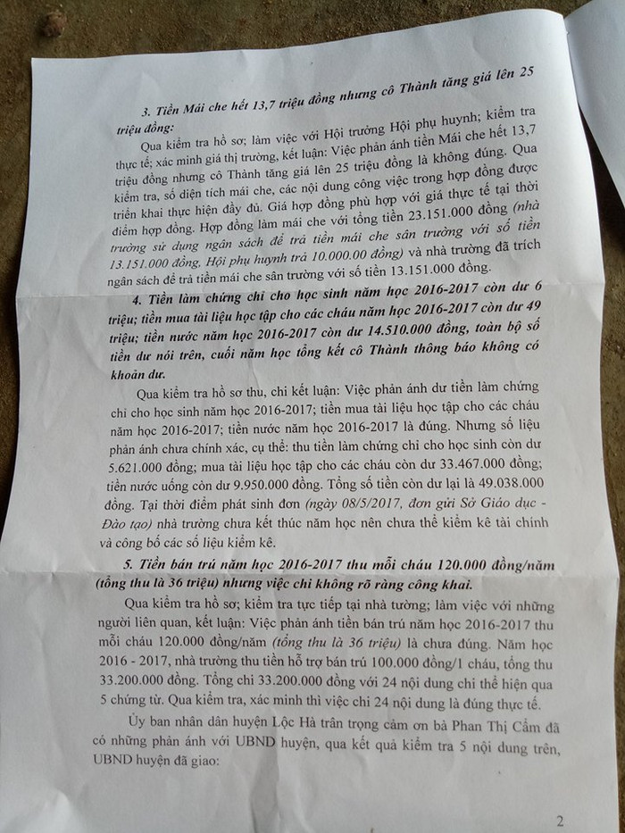 “Việc phản ánh cô Hoàng Thị Thành khi mua thịt lợn, thịt me cho bữa ăn bán trú năm học 2016-2017 tự ý tăng (giữa giá thực tế và giá nhập vào) để lấy phần chênh lệch là không đúng”;