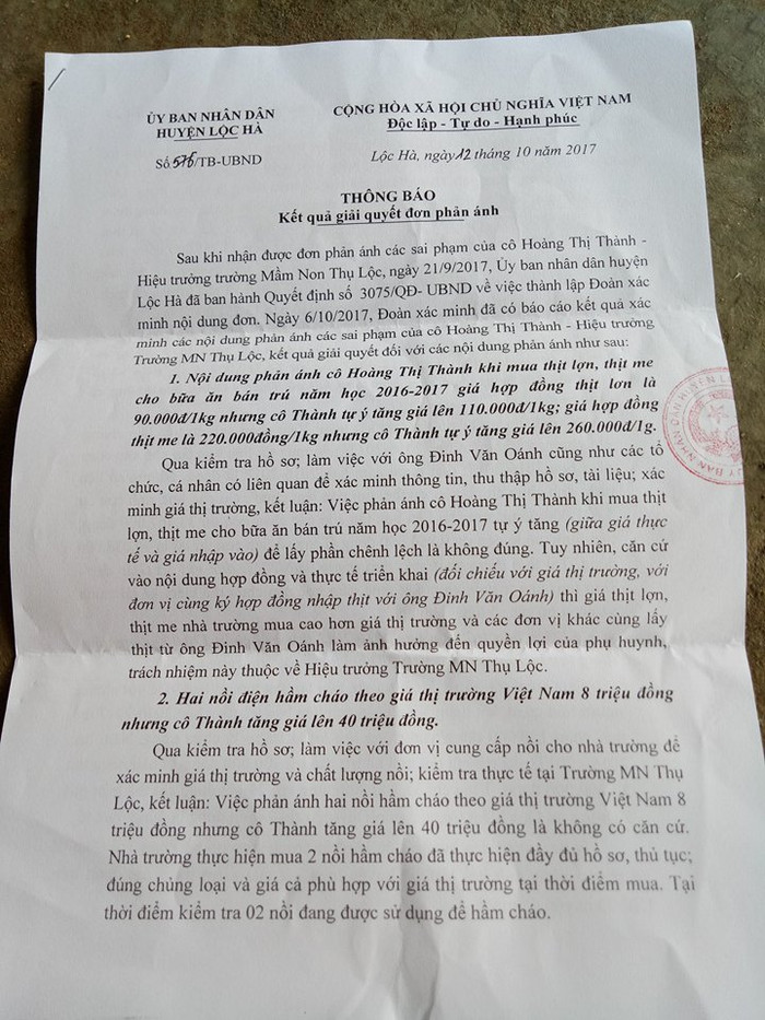 Ngày 12/10/2017, Uỷ ban nhân dân huyện Lộc Hà ra Văn bản số 576/TB-UBND “Thông báo kết quả đơn phản ánh” của cô Phan Thị Cẩm (thôn Đông Chau, xã Phù Lưu, huyện Lộc Hà, tỉnh Hà Tĩnh) về những sai phạm của cô Hoàng Thị Thành - Hiệu trưởng Trường Mầm non Thụ Lộc…