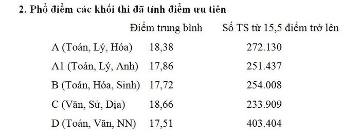 • Số lượng thí sinh đạt từ 15,5 điểm trở lên chưa lọc thí sinh trùng, nghĩa là một thí sinh có thể có tên trong nhiều khối thi.