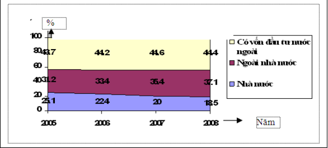 BIỂU ĐỒ THỂ HIỆN SỰ THAY ĐỔI CƠ CẤU GIÁ TRỊ SẢN XUẤT CÔNG NGHIỆP Ở NƯỚC TA PHÂN THEO THÀNH PHẦN KINH TẾ TỪ NĂM 2005 ĐẾN NĂM 2008
