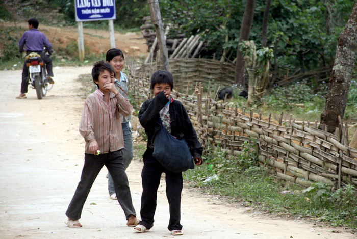 | Dưới trời nắng nôi, các em vừa đi vừa trò chuyện rất vui vẻ. Các em trong 1 xã thường tập trung lại với nhau cùng tới trường. |