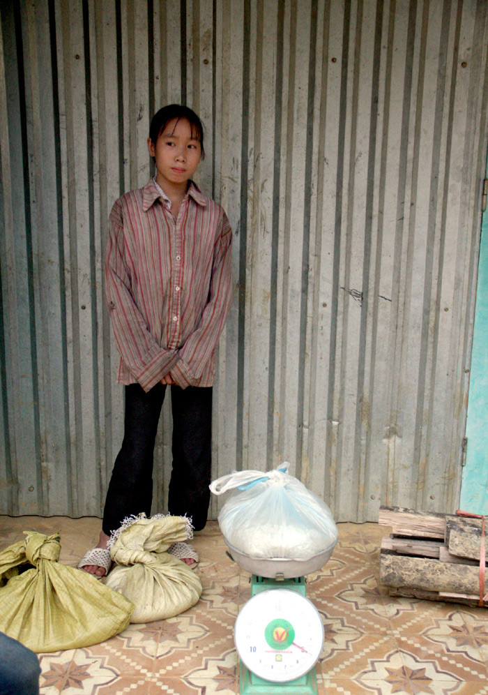 | Gạo nộp của học sinh cho nhà trường được cân và ghi lại đầy đủ. |