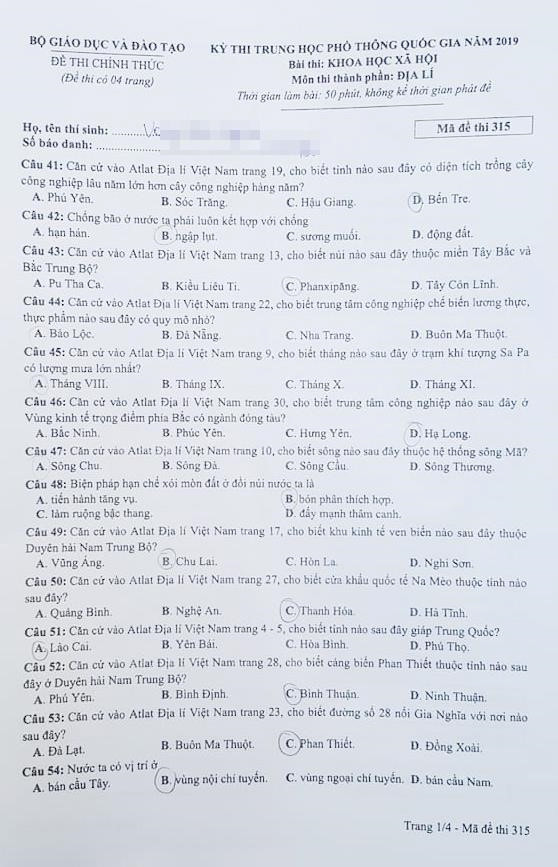 | Đề thi môn địa lí (ảnh báo Vietnamnet). |