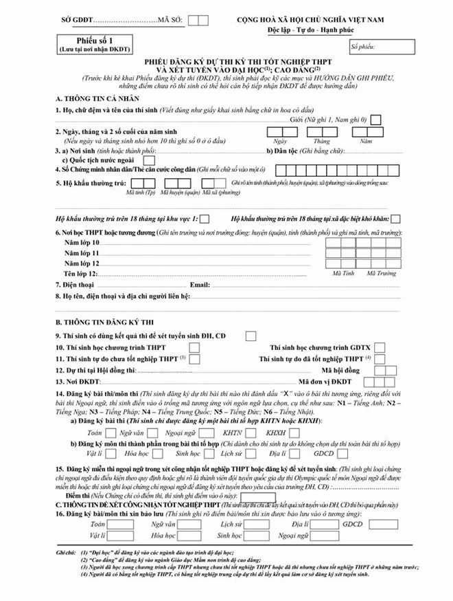Dưới đây là mẫu phiếu đăng ký dự thi và xét tuyển cụ thể năm nay: