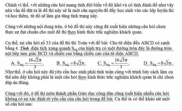 Cụ thể, trong bộ đề thi đã có những câu hỏi rất khó, mang tính chất đánh đố thí sinh mà nếu chỉ với những kỹ năng, kinh nghiệm và cách làm bài thông thường ở các học sinh hiện nay thì khó có thể giải quyết được, nhất là đây lại là những câu hỏi theo hình thức trắc nghiệm khách quan đòi hỏi thí sinh phải giải nhanh.
