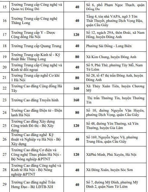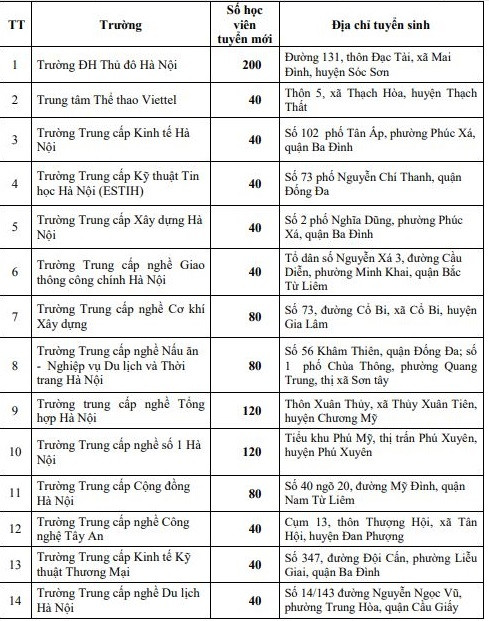 Theo đó, Trường Cao đẳng Công thương Hà Nội được tuyển 280 học sinh vào lớp 10, Trường Đại học Thủ đô Hà Nội tuyển 200 học sinh, trường Cao đẳng truyền hình và Trường Cao đẳng Cộng đồng Hà Tây mỗi trường được tuyển 160 học sinh.