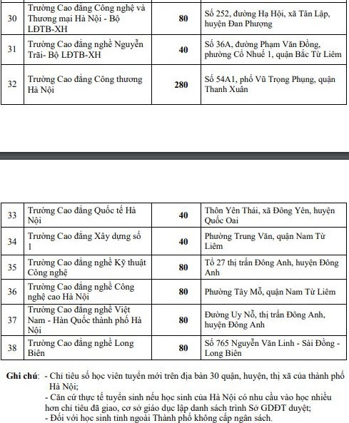 Sau đây là chi tiết chỉ tiêu tuyển sinh lớp 10 năm học 2020-2021 vào 38 trường đại học, cao đẳng, trung cấp chuyên nghiệp trên địa bàn Hà Nội: