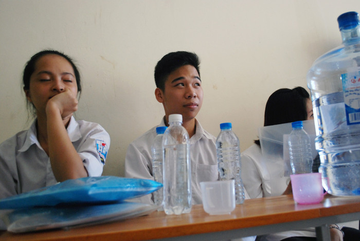 | Trước khi vào thi các thí sinh được tình nguyện viên hướng dẫn mang nước vào để chống chọi với nắng nóng. |