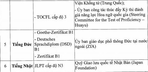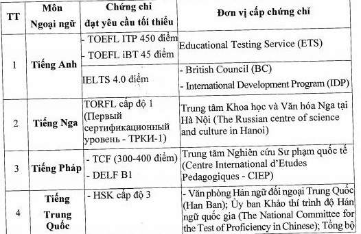 Thí sinh có một trong các chứng chỉ Ngoại ngữ (giống hoặc khác với môn Ngoại ngữ đang học tại trường phổ thông) hợp lệ, có giá trị sử dụng ít nhất đến ngày 8/8/2020 và đạt mức điểm tối thiểu theo bảng dưới đây: