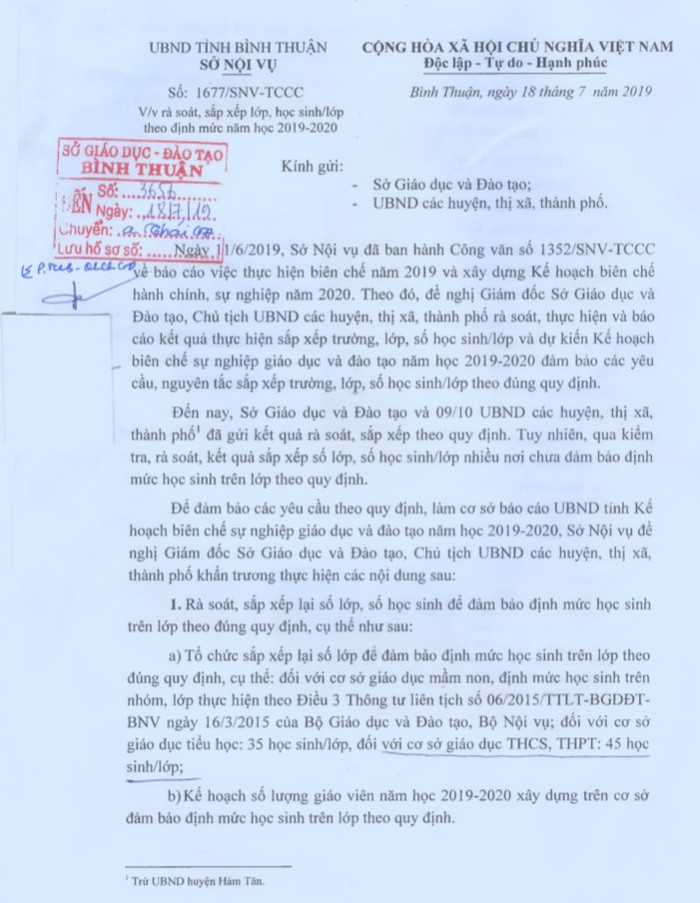 Ngày 18/7/2019, Sở Nội vụ tỉnh Bình Thuận ra văn bản số 1667/SNV-TCCC về việc rà soát, sắp xếp lớp, học sinh/lớp theo định mức năm học 2019-2020.