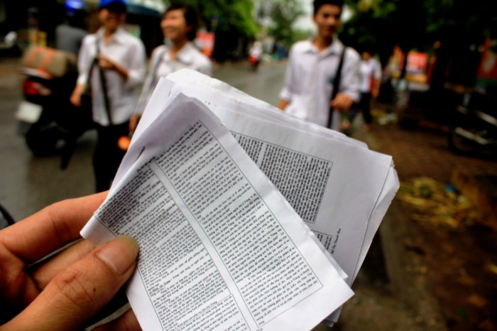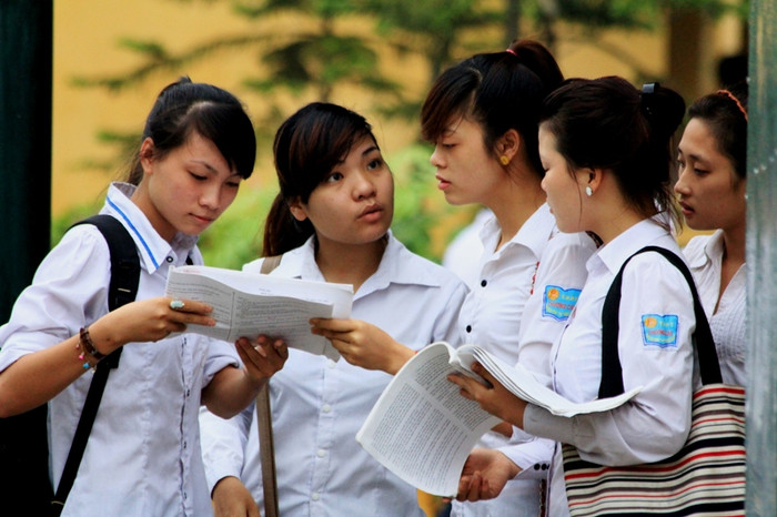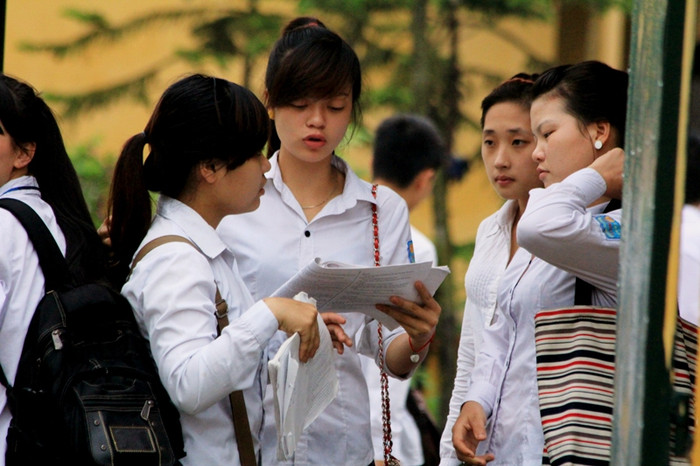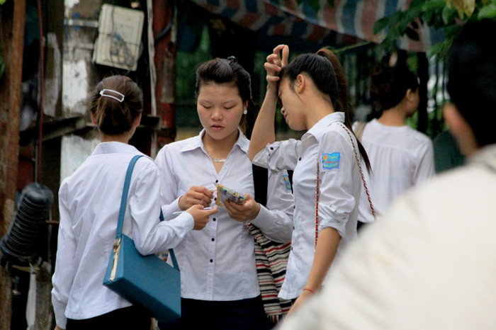 | Một tốp thí sinh nữ chuẩn bị tài liệu, xem những phần trọng tâm để đút túi mang vào phòng |