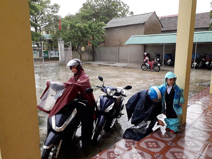 | Từ 7h sáng ngày 5/9, phụ huynh Trường mầm non Trường Sơn, Đức Thọ đội mưa đưa con đến khai giảng |