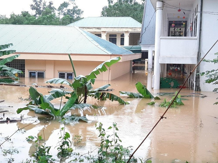 Cô giáo Nguyễn Thị Thu - Phó Hiệu trưởng Trường mầm non Điền Mỹ (Hương Khê) cho biết: “Tại thời điểm 7h ngày 05/9, cơ sở 2 trường em đã ngập hết cổng trường, cơ sở 1 sắp ngập lên tầng 2, em đang cùng với các vị lãnh đạo ủy ban chèo thuyền đến kiểm tra, ứng cứu tình hình lũ lụt trên địa bàn”.