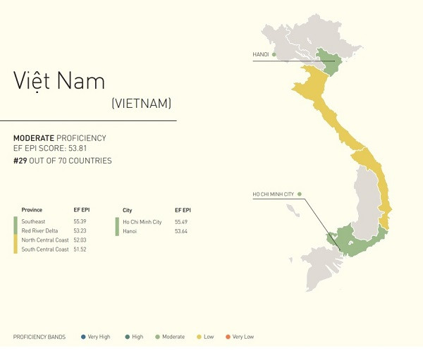 Riêng tại Việt Nam, Thành phố Hồ Chí Minh (54.49 điểm) được cho là có trình độ tiếng Anh cao hơn Hà Nội (53.64 điểm)