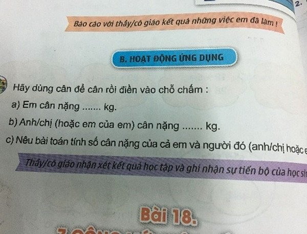 Hay trong chương trình lớp 2 (sách VNEN) ở phần bài tập ứng dụng (bài tập về nhà) đã yêu cầu: Hãy dùng cân để cân rồi điền vào chỗ chấm: