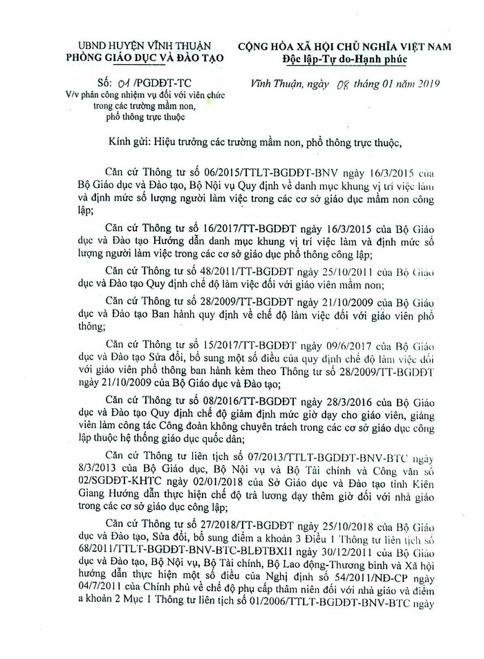 Cụ thể: Ngày 08/01/2019, Phòng Giáo dục và Đào tạo Vĩnh Thuận ban hành văn bản số 01/PGDDT-TC hướng dẫn phân công nhiệm vụ đối với viên chức trong các trường mầm non, phổ thông trực thuộc của huyện.