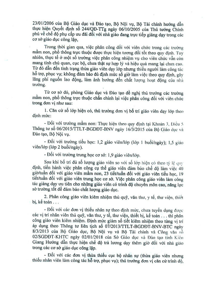 Nhưng, nhằm khống chế việc chi trả chế độ cho nhà giáo theo quy định hiện hành, ngày 8/01/2019 ngành giáo dục huyện Vĩnh Thuận đã ban hành một văn bản hết sức “lắt léo” để quy định định mức tiết dạy đối với giáo viên làm công tác kiêm nhiệm văn phòng.