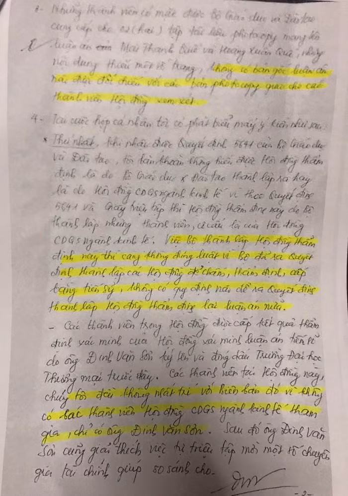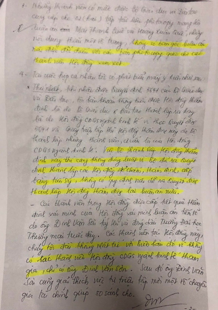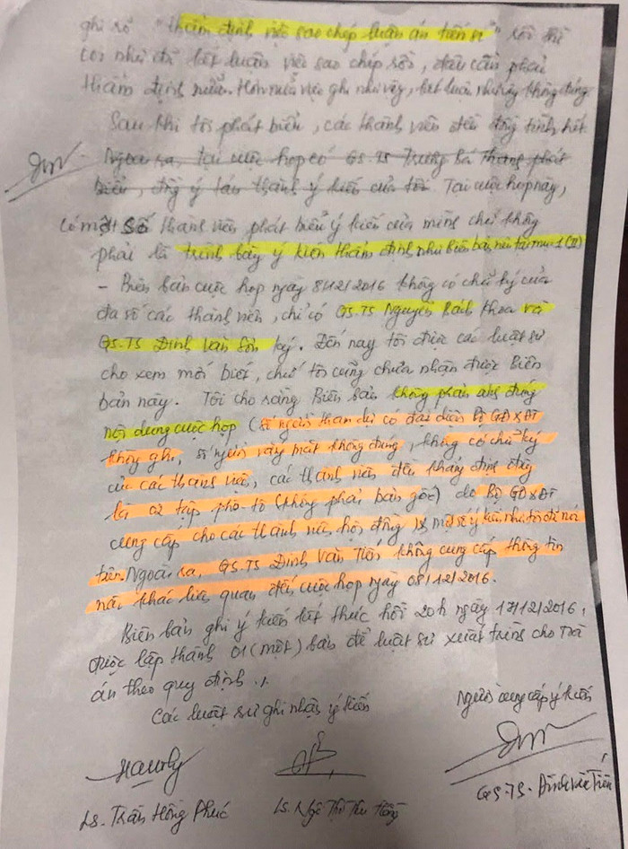 Biên bản cuộc họp ngày 8/12/2016 không có chữ ký của đa số thành viên, chỉ có Giáo sư-Tiến sĩ Nguyễn Bách Khoa và Giáo sư-Tiến sĩ Đinh Văn Sơn ký. Đến nay, tôi được các luật sư cho xem mới biết, chứ tôi cũng chưa nhận được biên bản này.
