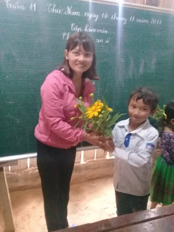 Trên tay là những đóa hoa dã quỳ giản dị được hái trên đường đến lớp, các cô bé cậu bé học trò người H'Mông đang học lớp 2 háo hứng tặng quà cô giáo của mình.
