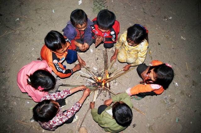 | Trời lạnh quá, không ngủ được, các em đành thức dậy đốt lửa sưởi ấm |