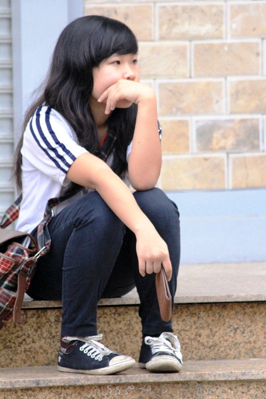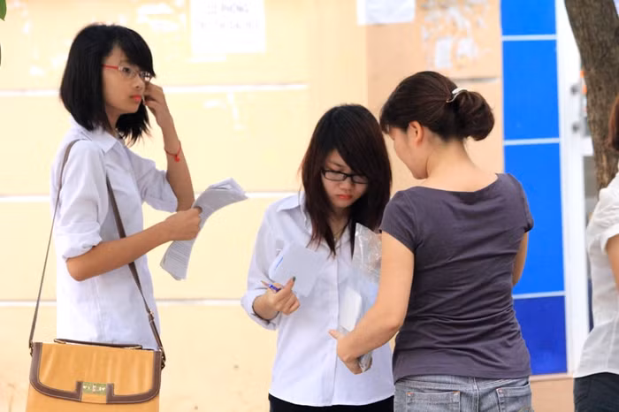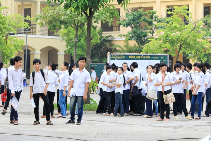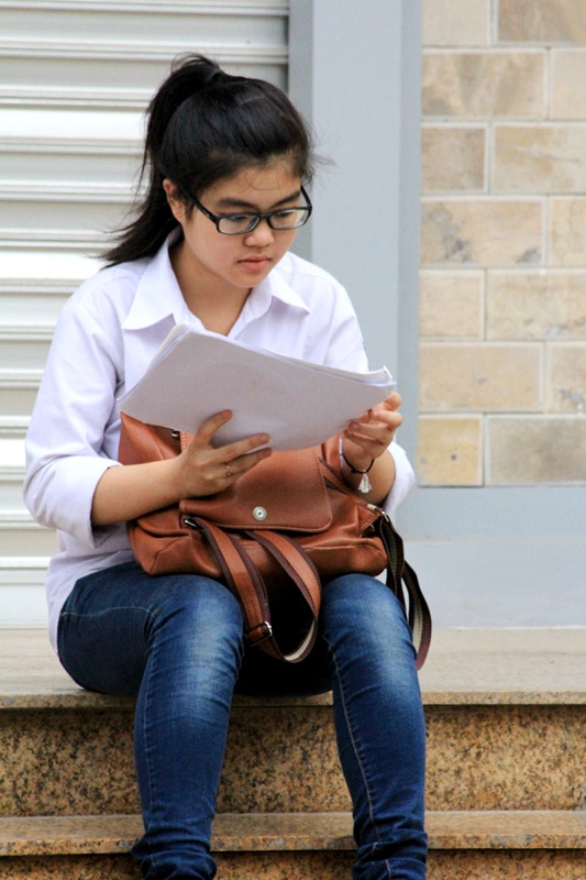 | Đến sớm, nhiều thí sinh tranh thủ ôn lại bài trước khi vào phòng thi. |