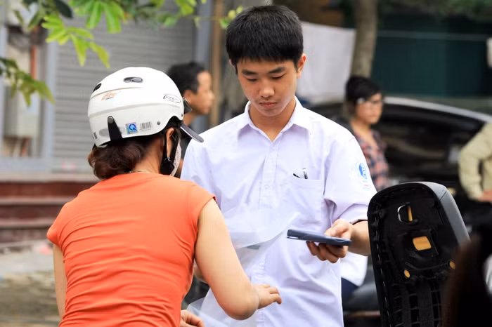 | Các em nhà xa được bố mẹ chở tới địa điểm thi từ sớm. |