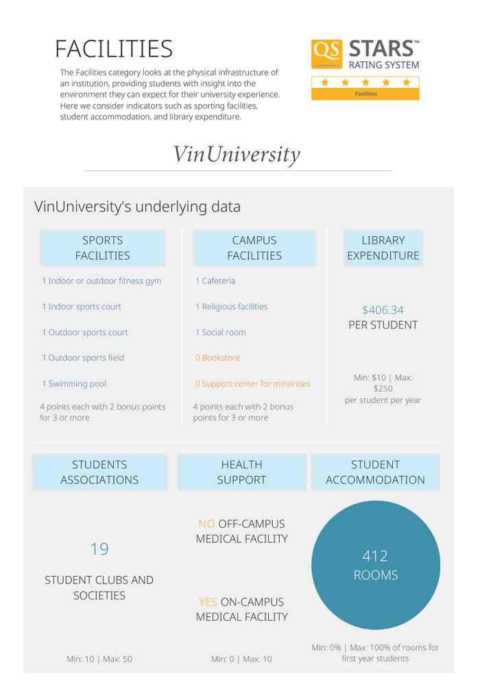 Hệ thống đánh giá Quacquarelli Symonds cũng ghi nhận số điểm 5 sao cho mô hình kí túc xá “3 cùng” tiên tiến của VinUni, gồm cùng học, cùng sống và cùng làm việc.