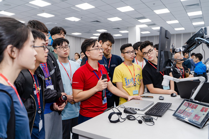 Đại diện trường đang giới thiệu với phụ huynh và tân sinh viên phòng Superlab (thực hành liên ngành) đầu tiên tại Việt Nam. Mô hình Superlab cho phép thực hiện đồng thời 6 lớp thực hành của 6 môn khác nhau, thuộc các chương trình đào tạo và của các khóa khác nhau.