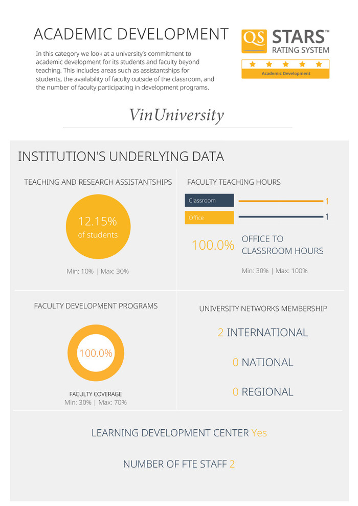 Phương pháp giảng dạy tích cực là một trong những điểm đặc biệt giúp VinUni nhận được điểm QS 5 sao cho. các trụ cột Phát triển học thuật và Phát triển toàn diện, bên cạnh Cơ sở vật chất.