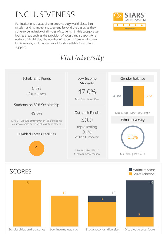 VinUni tham gia xếp hạng ở 8 lĩnh vực, tuy nhiên ở các lĩnh vực như Văn hoá nghệ thuật, Hoạt động cải tiến, Trách nhiệm xã hội, Việc làm của sinh viên..., chỉ có thể đánh giá toàn diện khi trường đi vào hoạt động.