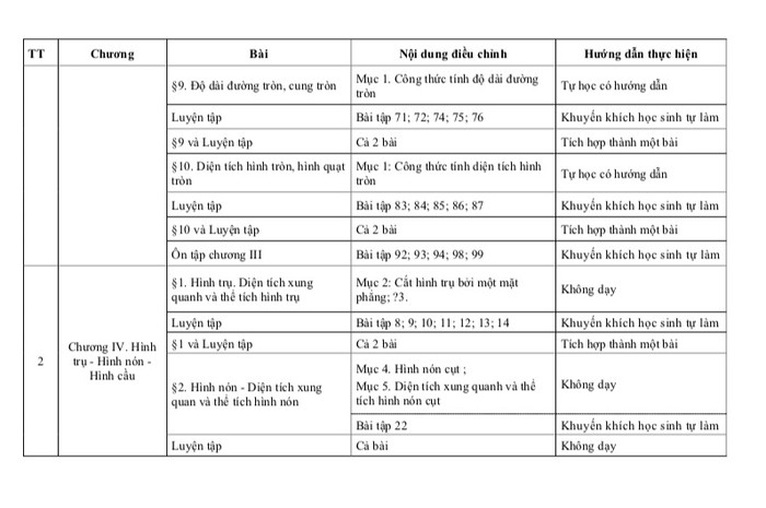 Cũng theo thầy Quang, nhìn vào nội dung điều chỉnh cho thấy phần kiến thức không dạy của lớp 9 là: Cắt hình trụ bởi một mặt phẳng, hình nón cụt.
