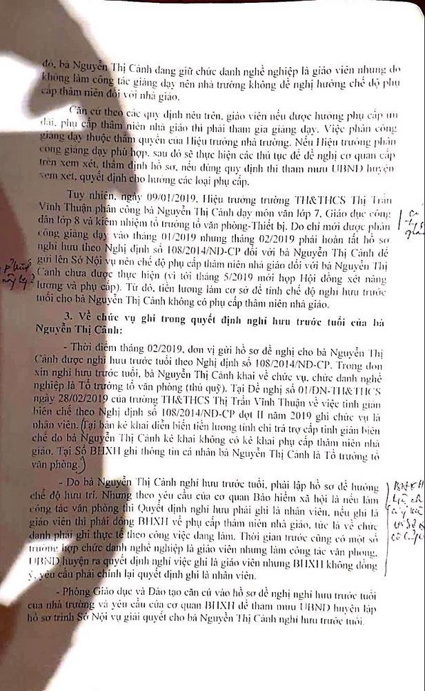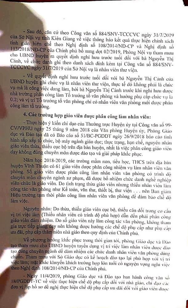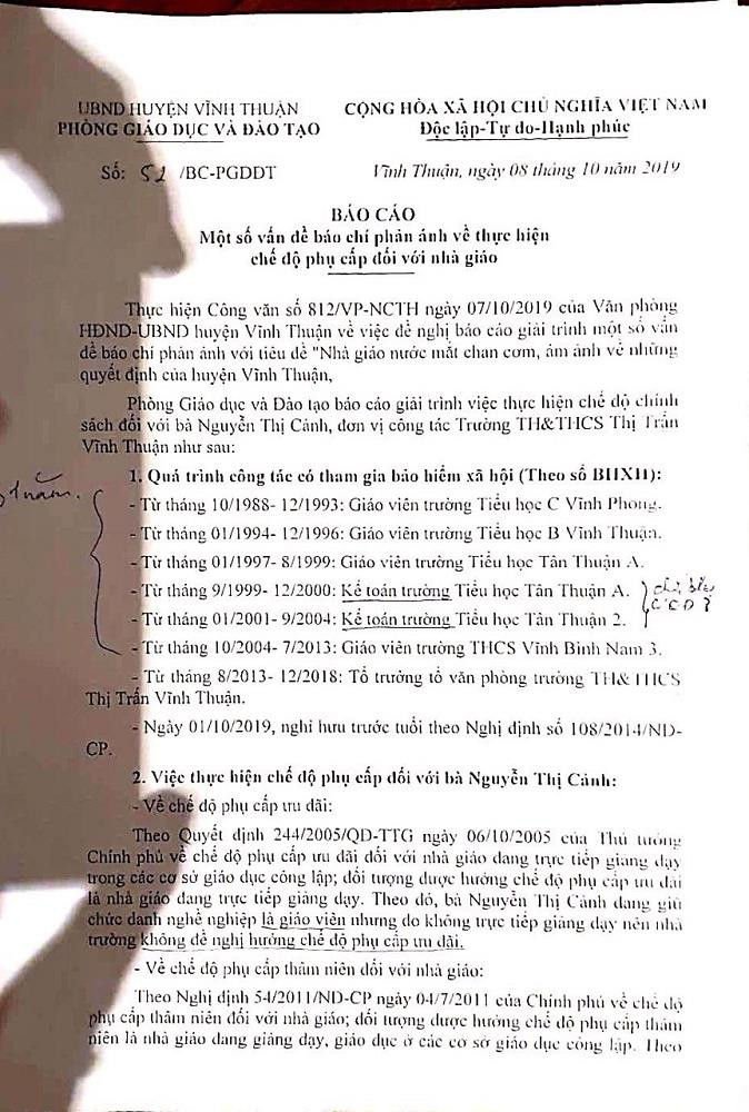 Ngày 8/10/2019, ông Huỳnh Minh Tâm, Trưởng phòng giáo dục huyện Vĩnh Thuận đã có văn bản giải trình gửi tới Ủy ban nhân dân huyện để giải trình về một số vấn đề báo chí phản ánh về thực hiện chế độ phụ cấp đối với nhà giáo.
