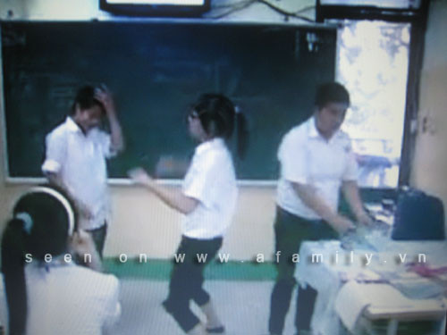 Ngay mở đầu đoạn clip là hình ảnh một nữ sinh tóc ngắn đang thực hiện một vài động tác uốn éo ngay trên phần bục giảng với sự cổ vũ của vài nữ sinh khác. Tuy nhiên, khi phát hiện bị quay thì nữ sinh đó đã vội dừng lại.