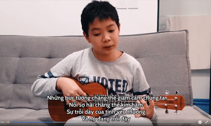 Cũng lấy âm nhạc là chủ đạo trong clip của mình nhưng bạn Phạm Tuấn Anh Minh (lớp 5 trường quốc tế Gateway) đã cùng cả gia đình sáng tác và biểu diễn bài hát tiếng Anh với tựa đề “We shall overcome”- Chúng ta sẽ vượt qua để cổ động người dân chống dịch.