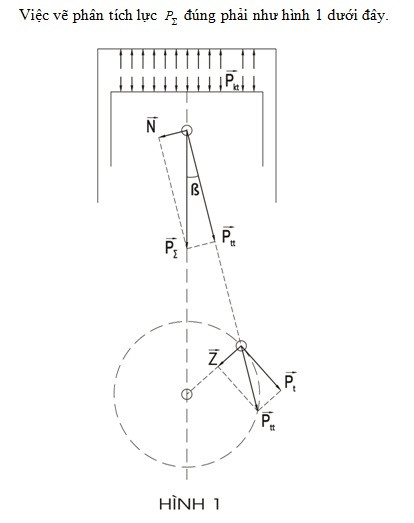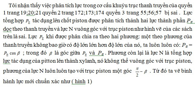 Việc cho lực N của piston tác dụng lên thành xylanh có phương vuông góc với trục piston dẫn tới việc vẽ bình hành lực sai như trong các sách trên , từ việc vẽ bình hành lực sai dẫn tới xác định sai độ lớn của lực tác dụng lên thanh truyền và các tính toán tiếp theo sẽ bị sai. Ta thấy: