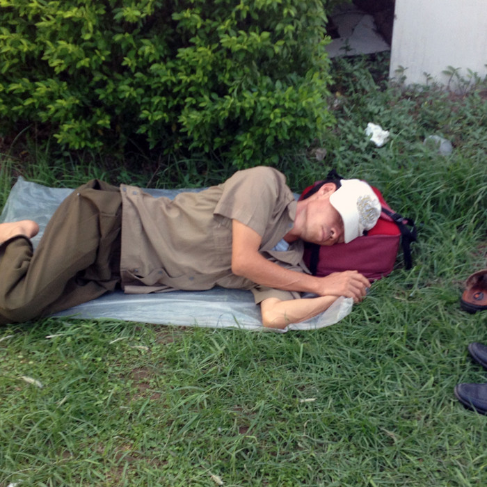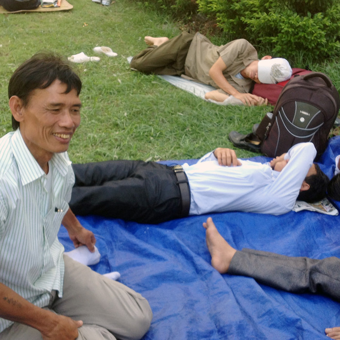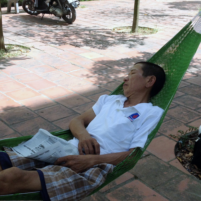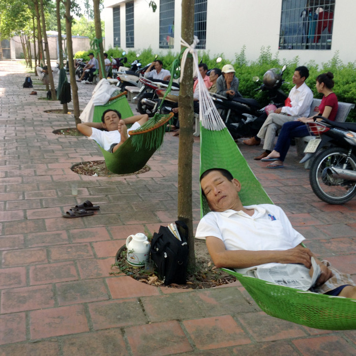 Ở Thái Bình, phụ huynh cảm thấy kiệt sức khi đứng ngồi không yên với sức nóng như đổ lửa. Những ông bố, bà mẹ tự mang những chiếc võng để chủ động đối phó với thời gian và nắng nóng trong lúc chờ con.