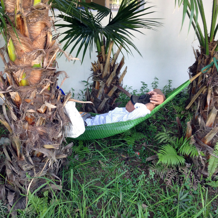 | Nhiều phụ huynh lựa chọn phương án mang theo võng để mắc trong lúc chờ con thi. |