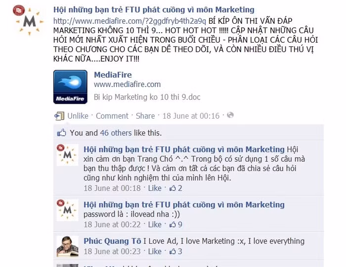 Ở "Hội những bạn trẻ FTU phát cuồng vì môn Marketing" (môn học này cực kỳ khó nhằn với dân kinh tế, đặc biệt là FTU vì thi dưới hình thức vấn đáp), có hẳn một note tuyển tập 100 câu hỏi vấn đáp, cùng link mediafire “Bí kíp Marketing không 9 thì 10”, cập nhật liên tục những câu hỏi đã xuất hiện trong kỳ thi. Bạn cũng sẽ được giải đáp những thắc mắc bên lề như thầy cô nào khó tính nhất? Nên chuẩn bị tâm lý ra sao?… Những kinh nghiệm vô cùng quí giá này được truyền từ “đời này sang đời khác” và đặc biệt hữu ích cho sinh viên khóa sau.