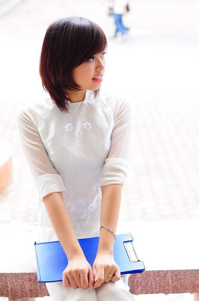 | Bùi Thanh Hằng thướt tha trong tà áo dài trắng. |