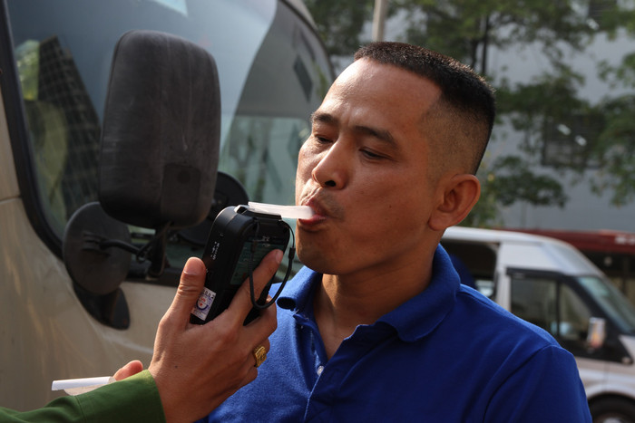 | Lái xe được kiểm tra nồng độ cồn. Ảnh: Vũ Phương. |