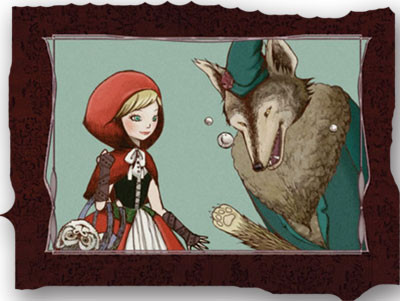 Những bản đầu tiên của câu chuyện cổ tích Cô bé quàng khăn đỏ cũng ghê sợ không kém. Đây là câu chuyện cổ tích của nước Pháp, dường như có từ thế kỷ 17, nội dung rất khác so với truyện do anh em nhà Grimm kể lại. Trong phiên bản này, con chó sói sau khi ăn thịt xong bà cụ còn để lại một ít máu và thịt cho cô bé quàng khăn đỏ ăn, thậm chí nó còn lột sạch quần áo của cô bé, quăng vào lửa rồi dụ cô bé lên giường.
