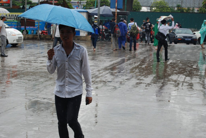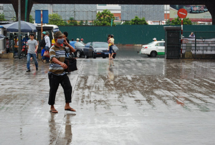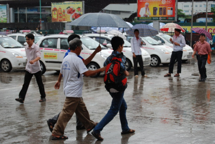 | Phụ huynh đang tìm bến xe bus trong trời mưa |