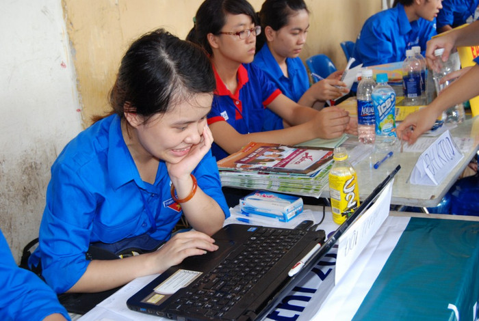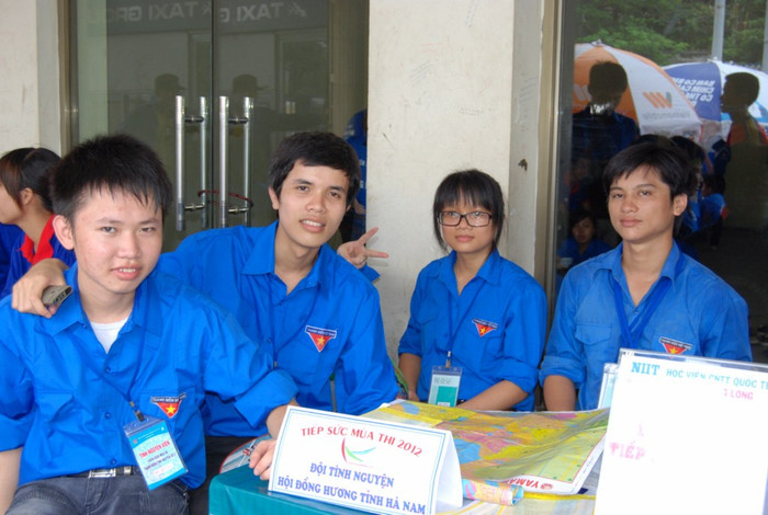 | Mặc dù trời mưa tầm tã cả buổi sáng nhưng sinh viên tình nguyện vẫn hăng hái bê đồ, giúp đỡ người nhà thí sinh. |