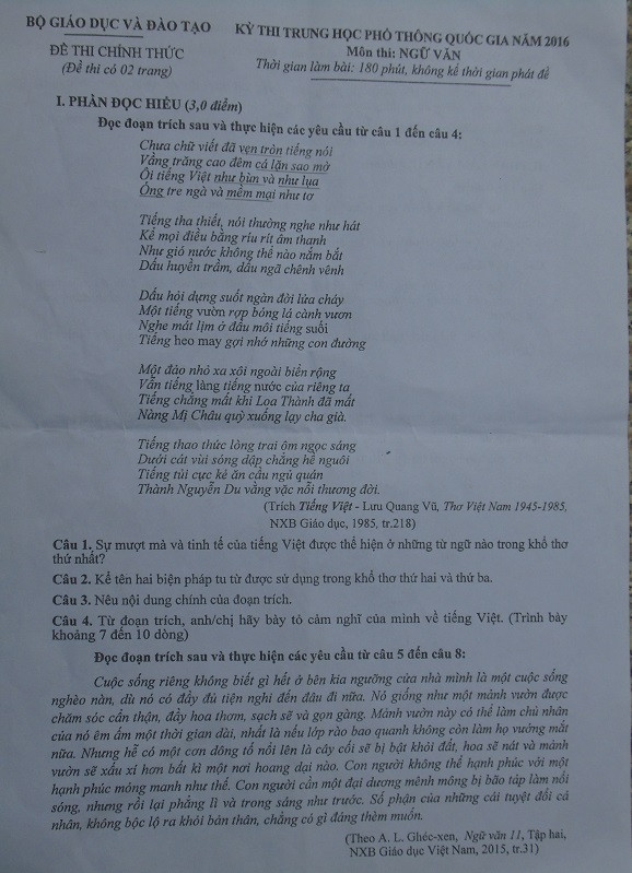 | Đề thi Ngữ văn THPT quốc gia 2016. Ảnh: Nguyễn Văn Lự |