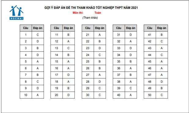 Vừa qua Hệ thống giáo dục HOCMAI đã có gợi ý đáp án đề thi tham khảo môn Toán, thí sinh có thể tham khảo:
