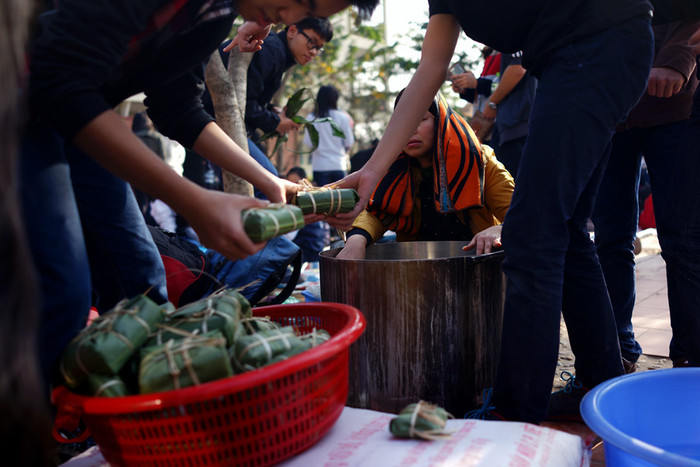 Bánh chưng nấu xong các trò phải tìm cách mời mọi người mua bánh, lấy tiền đó làm từ thiện.