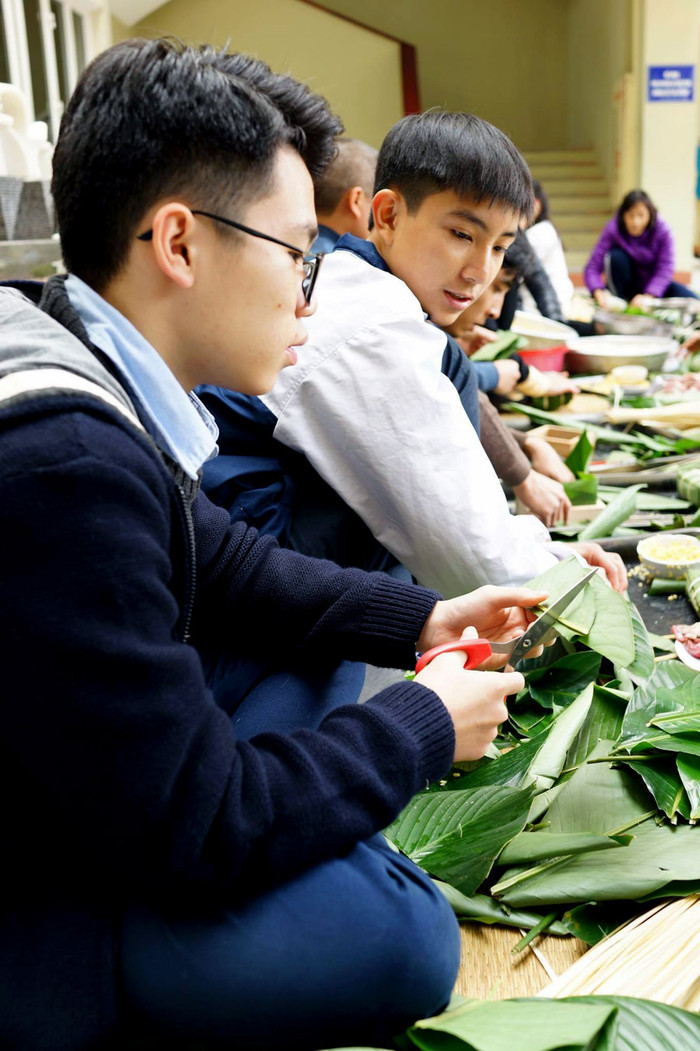 | Thầy và trò cùng nhau ngồi gói bánh chưng đón Tết. |