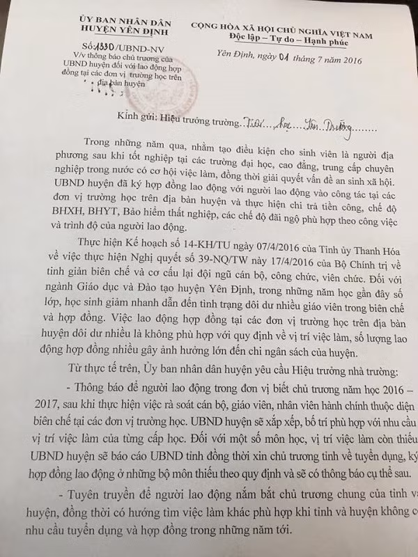 Ngày 1/7, UBND huyện Yên Định đã phát đi thông báo 1330/UBND-NV về chủ trương của UBND huyện đối với lao động hợp đồng tại các đơn vị trường học trên địa bàn huyện.